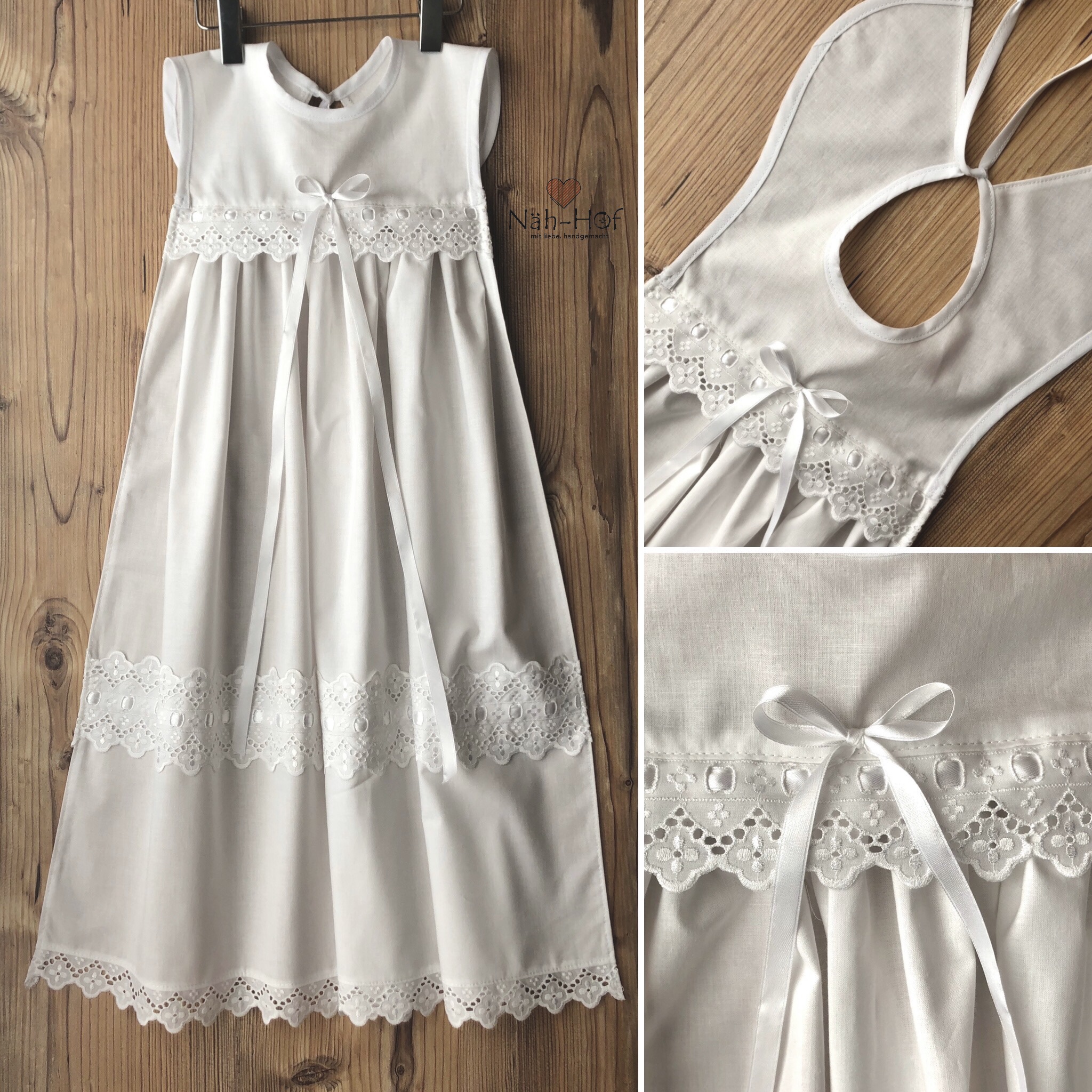 Schlicht, zeitlos, mit romantischen Spitzen und einer süßen Schleife – kann gerne noch mit dem Namen und Datum personalisiert werden. Besonders geeignet auch als Familien-/Generationentaufkleid.